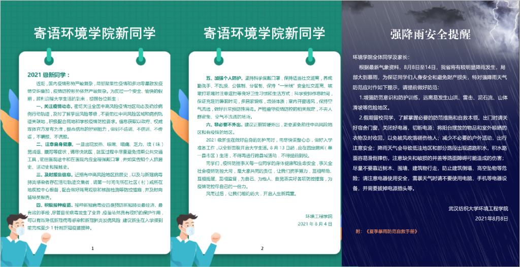 当前,国内疫情形势严峻复杂,局部聚集性疫情和多地零星散发疫情交织叠加,为提醒新生加强防护,确保按时健康入学,学院制作了《寄语环境员工新同学》《强降雨安全提醒》等海报,以公告形式发送至新生群,要求同学们点击公告确认收到。提醒大家关注疫情动态、及时报告信息、积极接种疫苗、加强个人防护、非必要不外出等,在条件允许的前提下,适当参与志愿服务活动,展现环境学子的责任与担当。