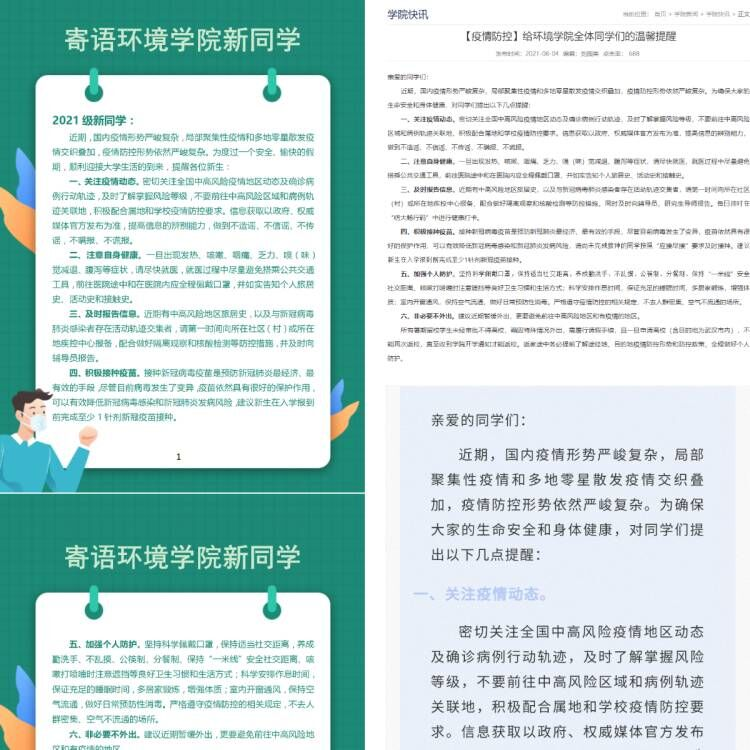 本次疫情爆发伊始,学院及时通过网站、微信公众号、QQ群及电话等多种形式,提醒师生关注疫情动态、注意自身健康、及时报告信息、积极接种疫苗、加强个人防护等。同时,对留校备考与科研的同学进行慰问,鼓励大家争分夺秒、安心在校学习,遵守防疫规定、非必要不外出;希望离校同学做好自身防护、加强身体锻炼,没有接到通知前不得提前返校。