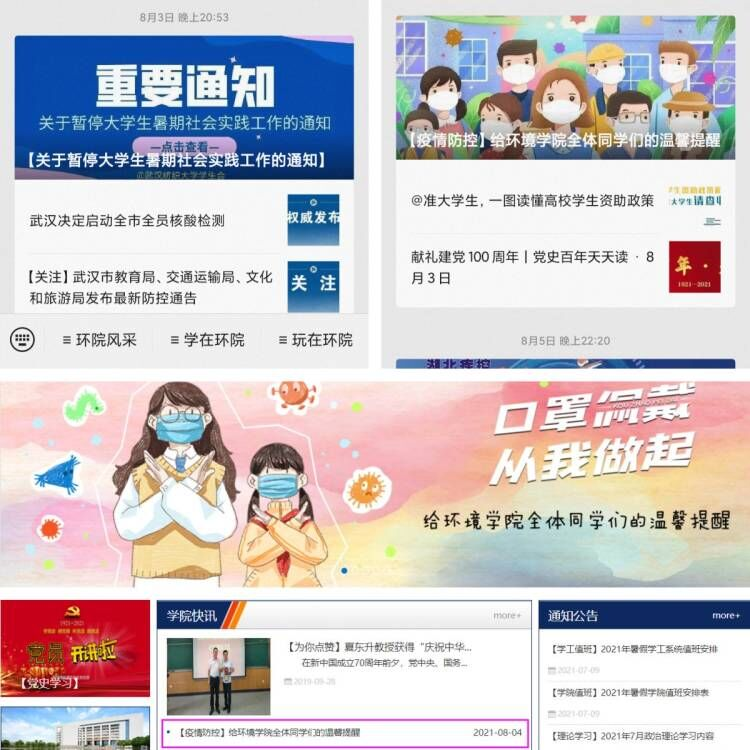 为方便同学们及时掌握疫情动态及政策精神,避免信息延误造成防控漏洞。学院充分利用网站、微信公众号等平台,每天转发全国疫情中高风险区、各级疫情防控精神,如《关于暂停老员工暑期社会实践工作的通知》《关于做好学校秋季开学前后疫情防控工作的紧急通知》等;辅导员做到每天与留校的每一位同学联系,实时掌握他们的身体状况;持续督促全院员工健康打卡,打卡率一直保持100%;引导同学们做好自身防护,不信谣、不传谣,鼓励在条件允许的情况下,以力所能及的方式开展抗疫志愿活动。
